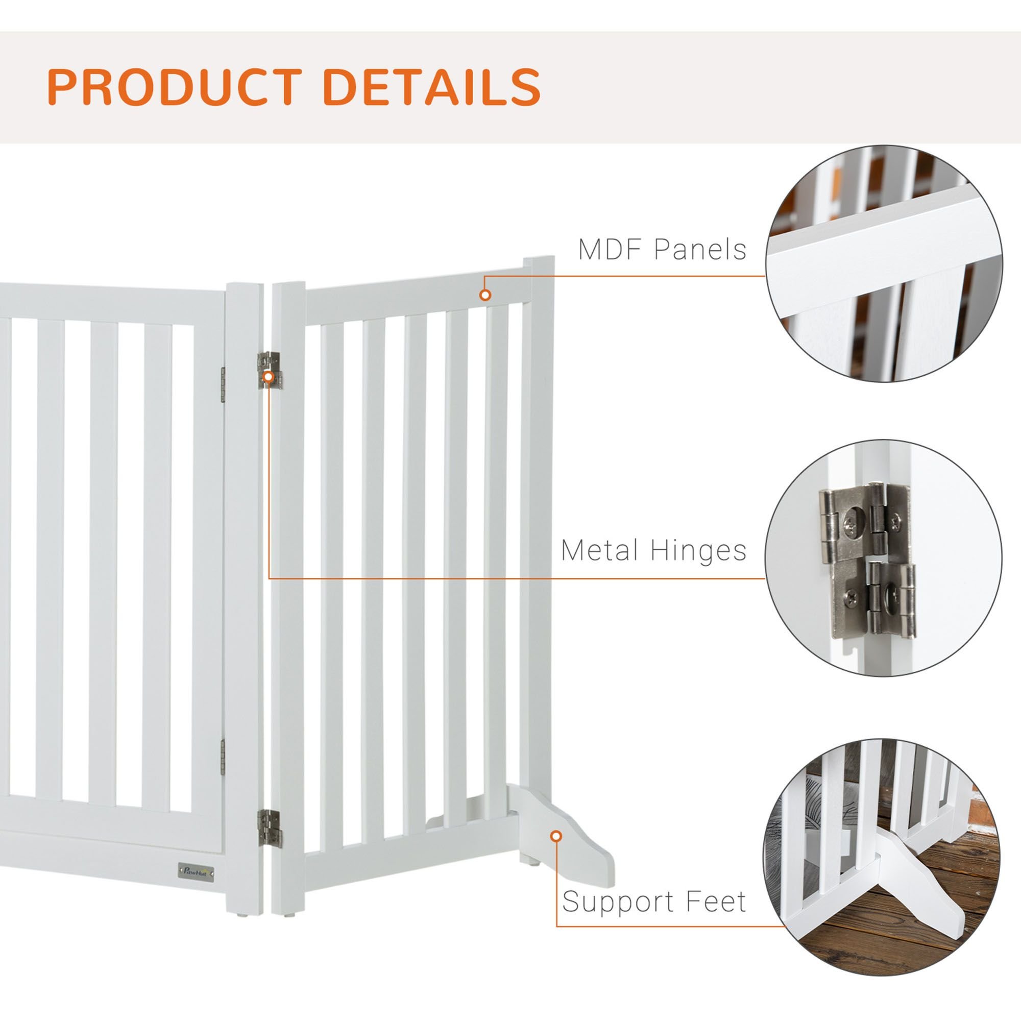 PawHut pet gates for dogs are a great way to keep your pets in an area while matching your home's style and modern design. This door has three flexible panels secured with hinges, which you can mould into different sizes, suitable for areas of various sizes. It has a double-sided folding system, allowing U/Z folding for easy storage. Constructed of MDF, suitable for daily use. It includes a pass-through door for easy entry and exit.