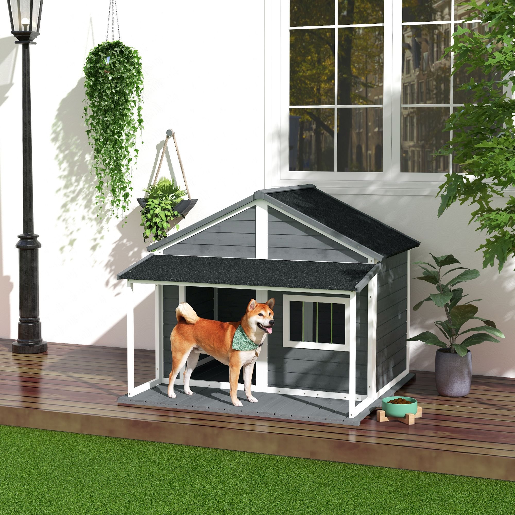 Make your dog feel at home even while outside with the PawHut big porch dog house. This cabin-style dog house has a large living room and a patio, so your pet will have space to rest while soaking up the sun. This dog house has a door, and side windows for comfortable air circulation. It also has an asphalt roof to protect your dog from weather, rain, or shine. Give your pet a stylish new home with a PawHut.