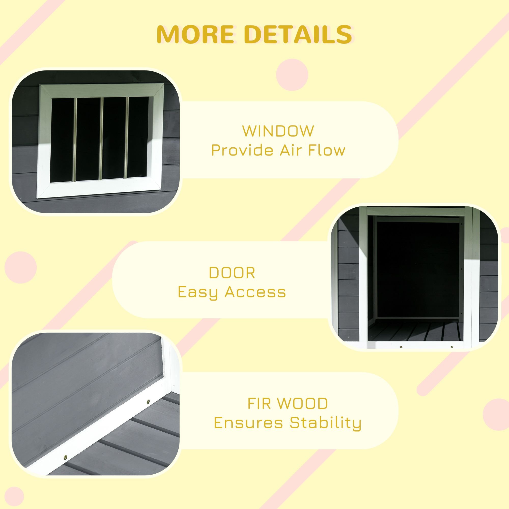 4.- Solid Construction: Our outside dog house is made from fir wood and sturdy enough for medium to large dogs 53 lbs. or less..