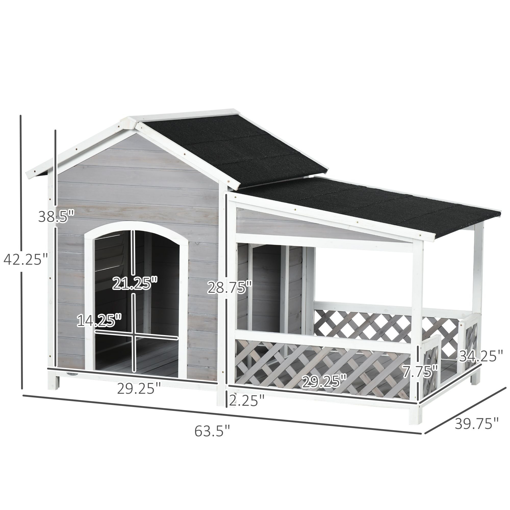 1.- Roofed Porch: Surrounded with cute fence motifs, an attached patio upgrades our large dog house. This porch offers roof-protected fresh air in a roomy 2-in-1 design..