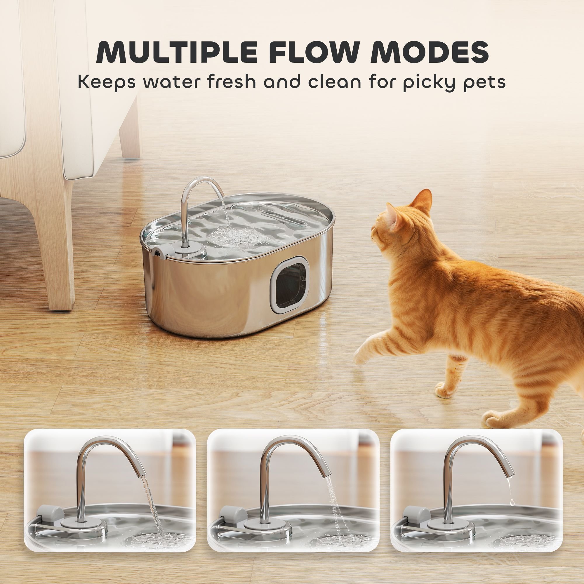 1.- Clean and Healthy: Built from food-grade 304 stainless steel, this pet water fountain is built to last and easy to keep clean. Equipped with an intelligent induction water outlet system to ensure fresh water supply for your pet