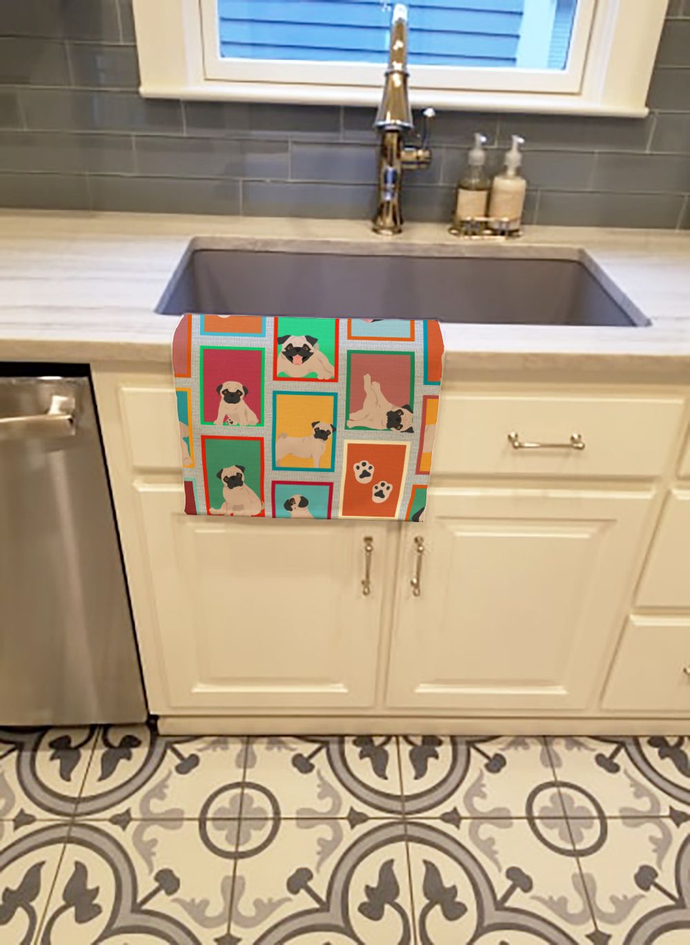 Kitchen Towel featuring breed specific Pug artwork. Experience the perfect blend of aesthetic appeal and functional excellence with our Plush Velour Kitchen Towels. These are not your ordinary decorative kitchen towels that gather dust. Instead, they are designed to be as practical as they are stylish. The front layer of our towel is constructed from a minky plush polyester, known for its durability and color retention. Unlike conventional kitchen towels, the artwork on our towels is dyed directly into the fabric, ensuring vibrant colors that last. Polish your glassware to a brilliant sparkle using the plush front side of the towel. Flip to the back, crafted from 100% cotton terry loop, to exploit its exceptional absorbency for drying dishes or wiping down counters. Our kitchen towels redefine the concept of functional art, offering lasting quality that maintains the towel's shape over time. Measuring 15 inches by 25 inches and weighing 2.3 lbs per dozen, these towels deliver an overwhelming sensory experience with their soft, plush, and smooth texture. The edges are meticulously finished with binding, enhancing their durability and visual appeal. For your convenience, these towels are machine washable and can be dried on low heat. After the first wash, the top fabric becomes even softer and fluffier, eliminating the need for ironing. Treat your kitchen to the luxury and functionality it deserves with our plush velour kitchen towels.