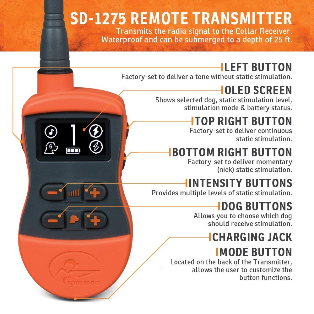 The SportTrainer 1275 gives you long distance control of your dog and features an easy-to-read, bright OLED screen that clearly displays the selected dog, static stimulation level and mode, and battery status. Large plus/minus buttons make toggling among dogs and changing stimulation levels a breeze, making the SD-1275 especially suited for multi-dog training.