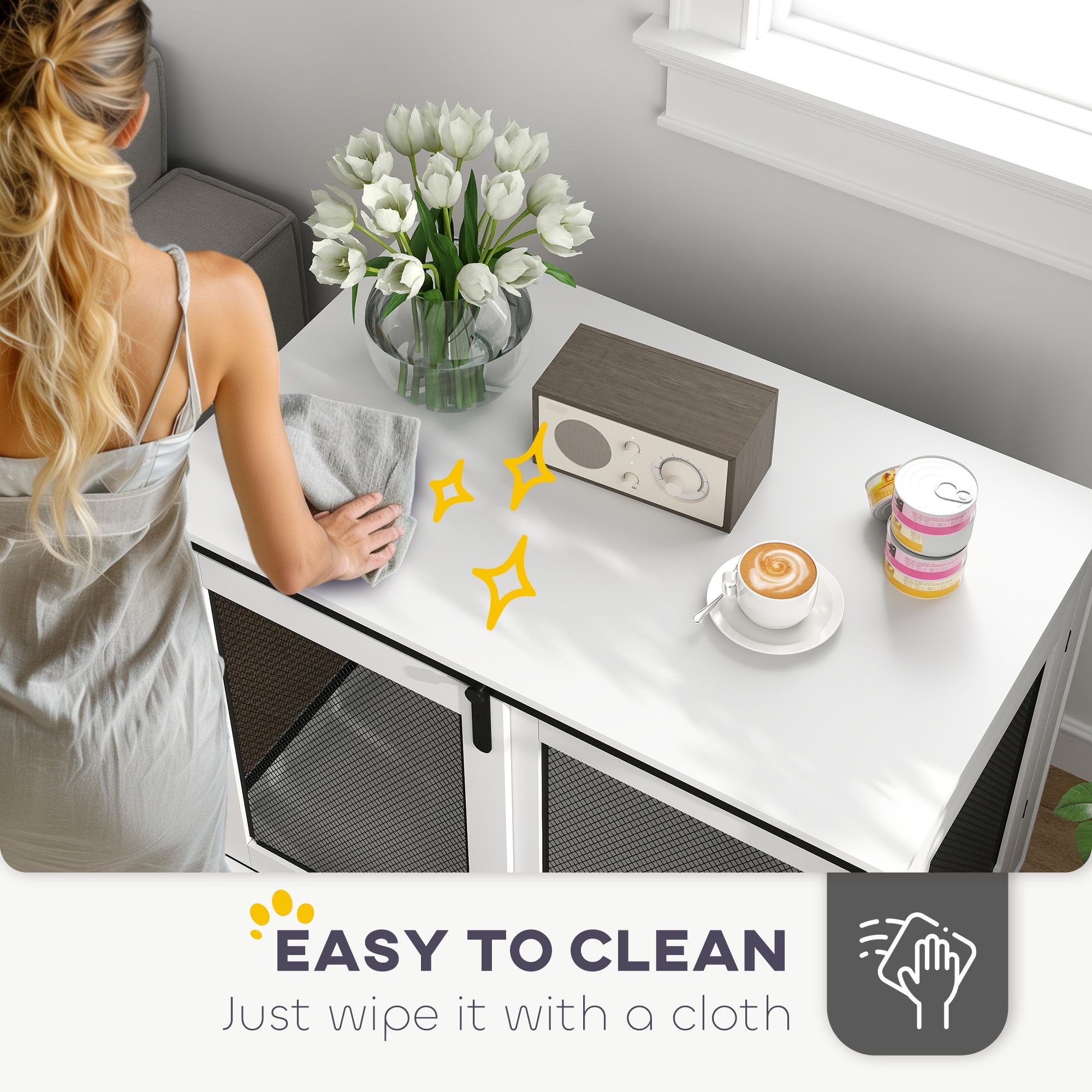 • • Serves as a dog crate or stylish side table