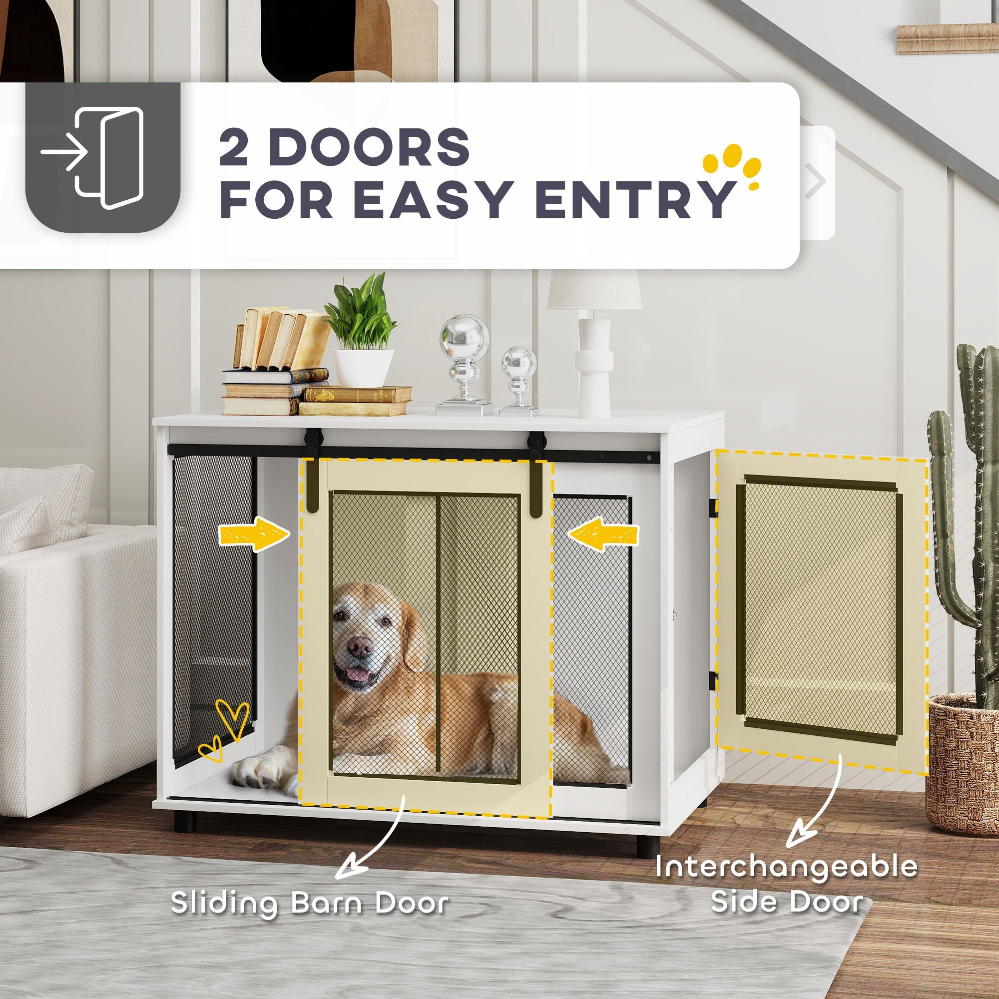 Discover the versatile PawHut large dog kennel furniture, where functionality meets style! Use it as a cosy dog crate or a chic side table; its particleboard and fine mesh grid design keep your furry friend from chewing. Boasting a dual-door setup, including a stylish barn door, this piece ensures comfort with a three-sided ventilation system and spacious interior for large dogs.