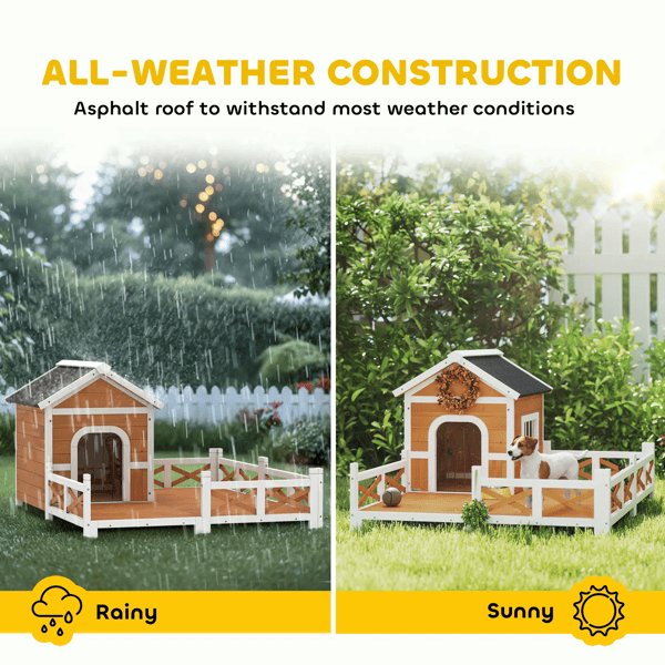 Worried about your dog's safety and mess while enjoying outdoor freedom? Unpredictable weather and cleaning can be a hassle. This PawHut outdoor dog house solves it all with a secure fenced terrace for play and an asphalt roof for shelter. Spacious enough for small to medium dogs, the wooden dog house offers both comfort and freedom to move around. Easy to maintain, it's suitable for keeping your dog safe and comfortable outdoors or giving stray animals a warm place to rest.